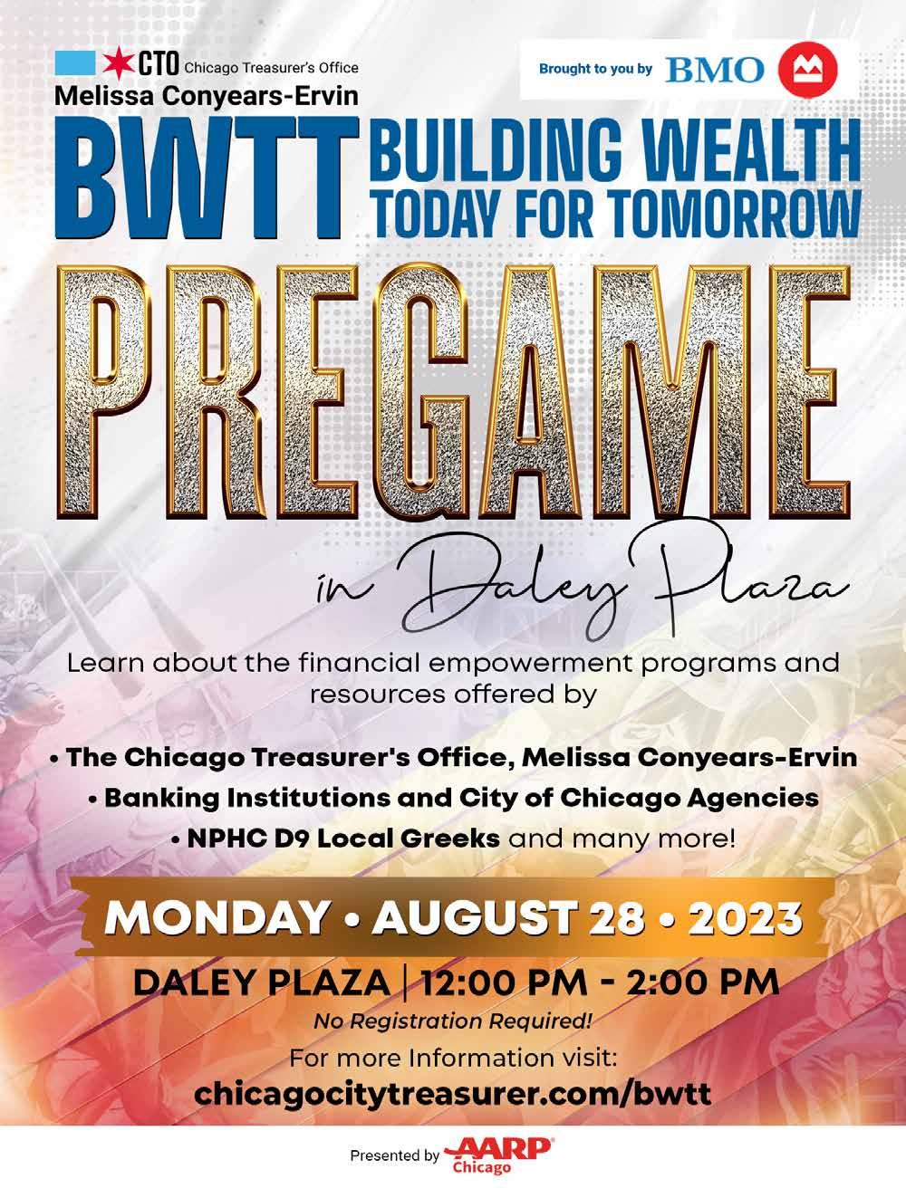 The City Treasurer’s Office (CTO) will present “PreGame,” a financial services resource fair open to the public and featuring financial experts from AARP, BMO, and the National Pan-Hellenic Council on Monday, August 28, from 12 - 2 p.m. at Daley Plaza, 50 W. Washington Street. The financial services experts will offer advice to individuals and entrepreneurs on building long-term wealth and a brighter financial future.