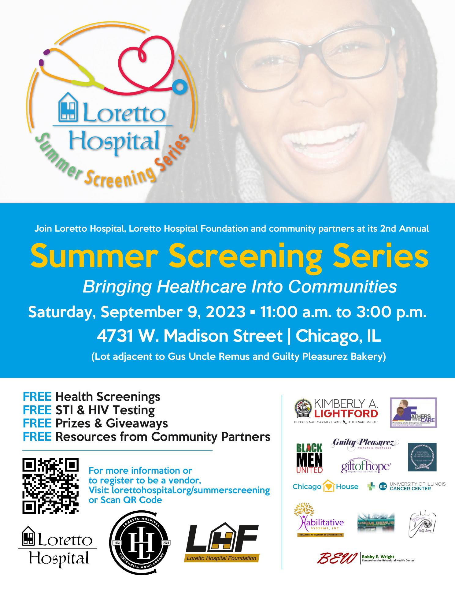 Participating partners in Loretto’s Summer Screening Series include Loretto Hospital Foundation, Illinois Senate Majority Leader Kimberly A. Lightford, Fathers Who Care, Black Men United, Chicago House, Women of Self Love, Inc., University of Illinois Cancer Center, Gift of Hope Organ & Tissue Do nor Network, Habilitative Systems, Inc., Westside Community Stakeholders, and Bobby E. Wright Comprehensive Behavioral Health Center. For more information, visit www.lorettohospital.org/summerscreening.