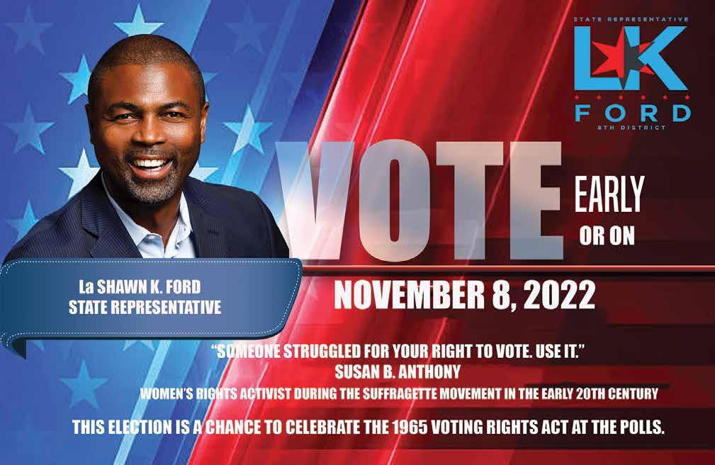 Maria Pappas (D) is running for reelection. Since 1998, Pappas has held this po sition for the state. During her term, she initiated Cook County’s Debt Disclosure Ordinance which mandates taxing districts to publicly report their finances, in cluding long-term debt. Peter Kopsaftis (R) is the Republican candidate. His polit ical experience ranges from Chairman/Committeeman of the Barrington Township Republican Organization and was the former Candidate for the 8th U.S. Con gressional District. As a candidate, he plans to make the Treasurer’s Office accessi ble to schedule town halls and forums to advocate for issues that are at the fore front of the community. Candidate Michael Murphy (L) who advanced from the Libertarian Party in June, is also running for the Cook County Treasurer position. Early voting is underway, and Nov. 8 is the General Election date. It is imperative for people of color to research each candidate and make a conscious and well-informed choice during this year’s election. Life-altering decisions are at the heart of these rac es, and people of color will be affected the most. Voting is a privilege. It is right that was given to many and earned for others. Your voice matters. Your vote matters.