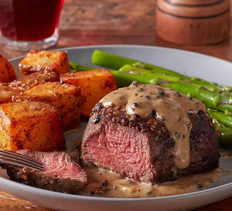 3. Place the peppercorns in a zip-top bag and use a rolling pin or heavy-bottomed skillet to roughly crush them. Place the crushed peppercorns in a shallow dish. Press the filets into the peppercorns to create a crust on both sides. Reserve any leftover crushed peppercorns (you should have about 2 teaspoons).