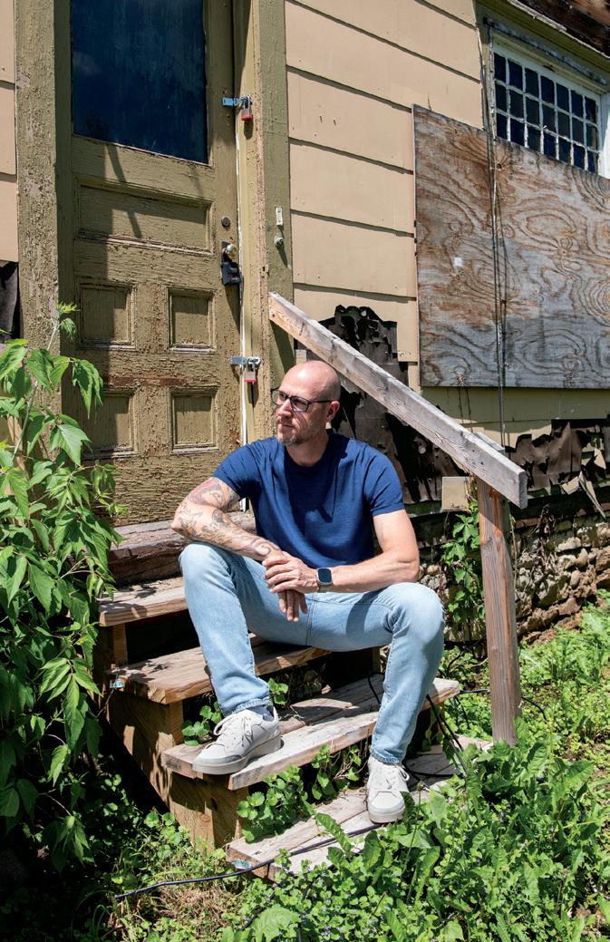 Pictured: Chedy sits on the steps of his childhood home on Kenmore Avenue in Syracuse.