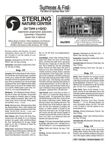 Brockway auction and fireworks. For more information please call 607-756-6499 or 607-753-8463 or visit the website at www. brockwaytrucks.org Syracuse. Shakespeare-In-The-Park 2013 - A Winter’s Tale. See Aug. 8 listing. Skaneateles. Skaneateles Chamber Music Festival. See Aug. 8 listing.