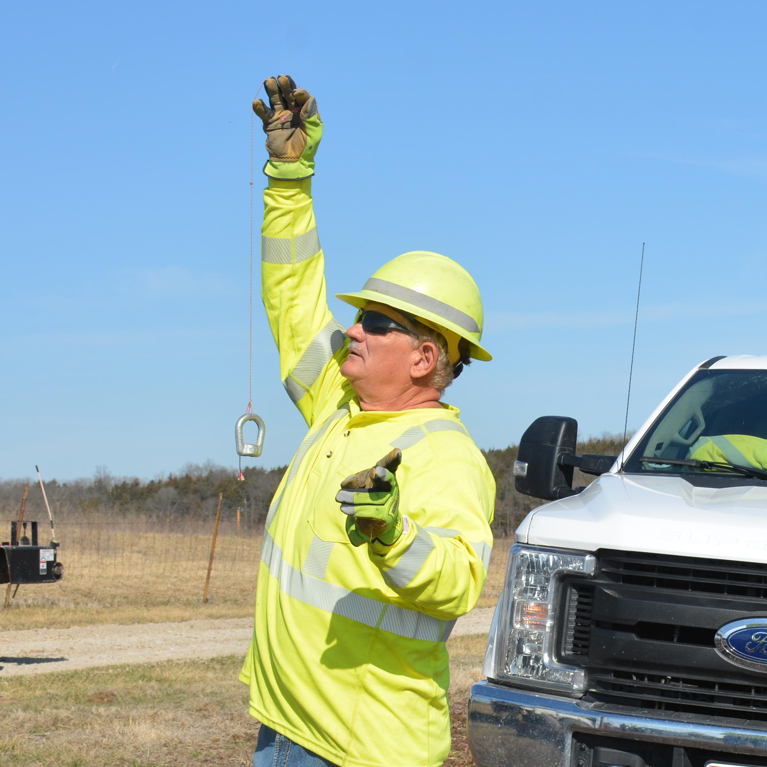 Once the pole is in the ground, we use a tool called a plumb bob to make sure the pole is straight. When the pole lines up with the string on the plumb bob, we know it is ready!