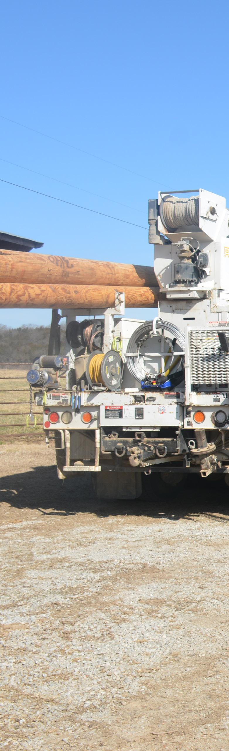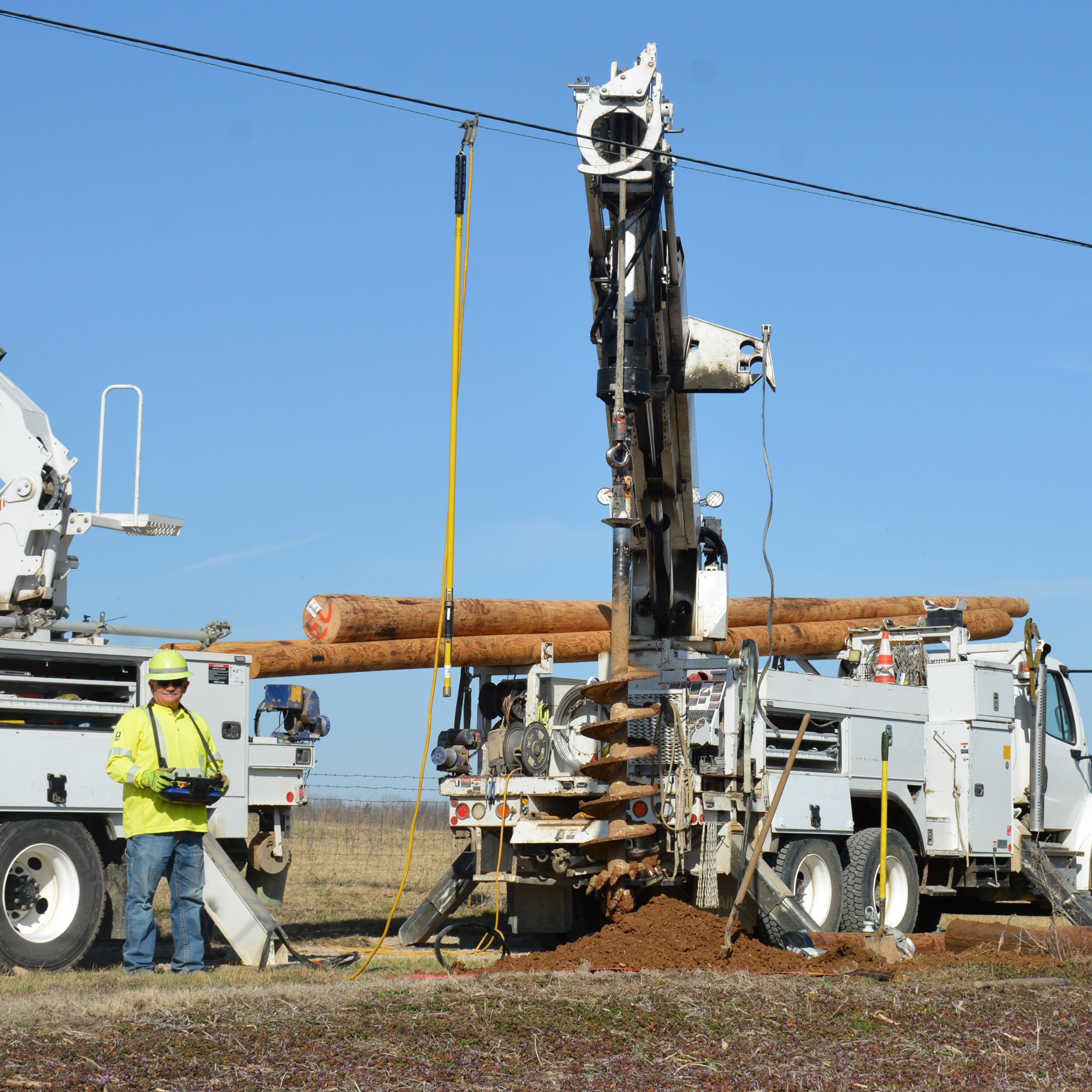 To make sure the hole is big enough for a new power line pole, we use a big drill on one of our trucks called an auger. You can see Danny working the remote controls to make the auger drill down and make the hole!
