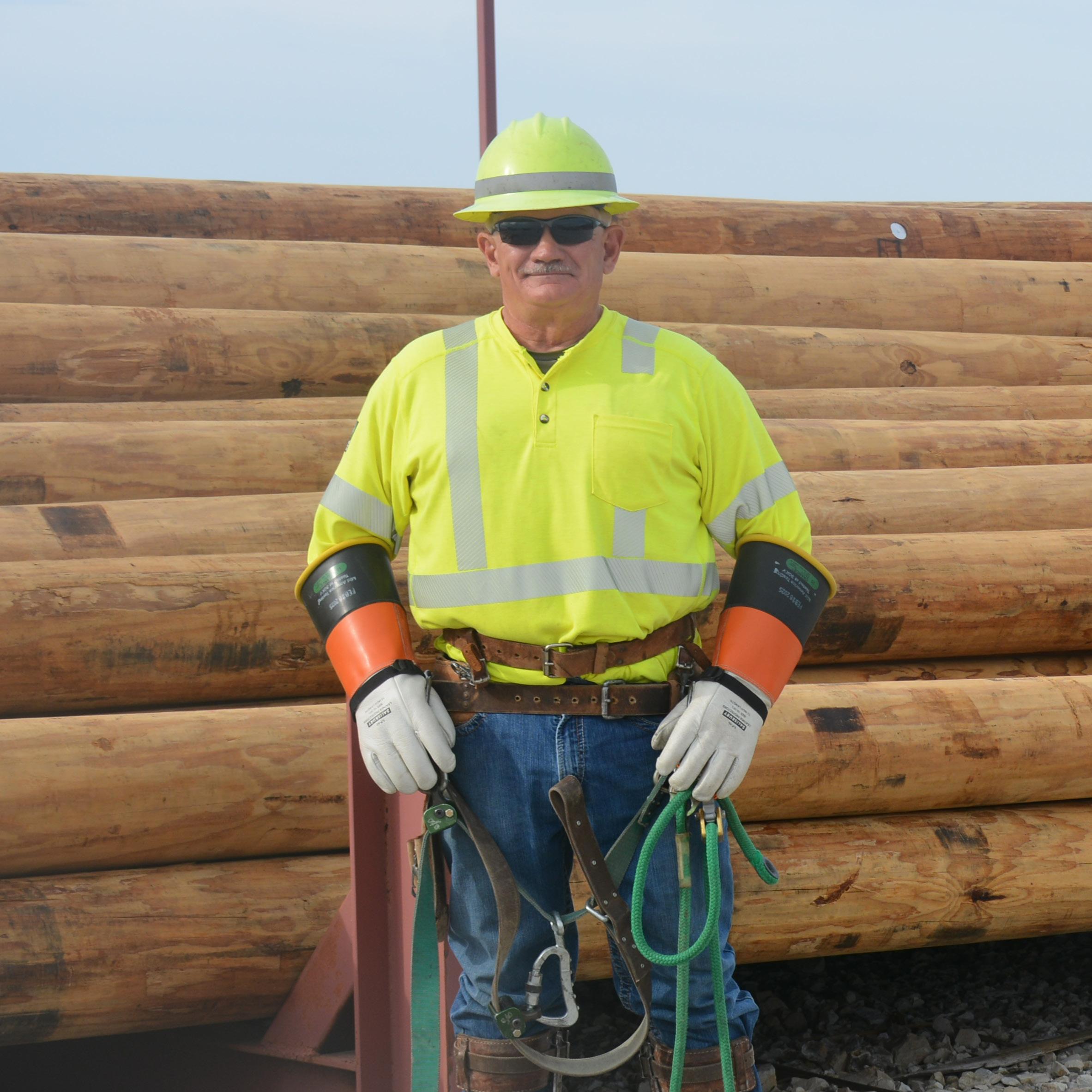 We wear hard hats, clothes, or vests with reflective safety strips and insulated gloves that protect us from getting shocked by electricity while working on power lines.