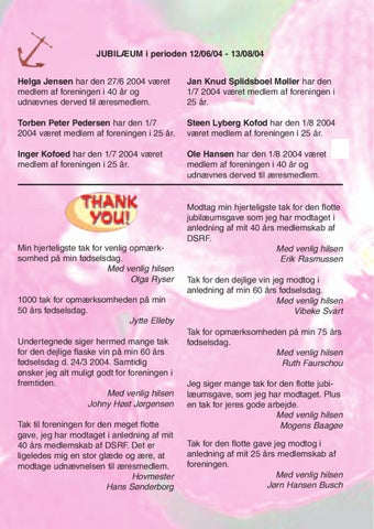 Min hjerteligste tak for venlig opmærksomhed på min fødselsdag. Med venlig hilsen Olga Ryser 1000 tak for opmærksomheden på min 50 års fødselsdag. Jytte Elleby Undertegnede siger hermed mange tak for den dejlige flaske vin på min 60 års fødselsdag d. 24/3 2004. Samtidig ønsker jeg alt muligt godt for foreningen i fremtiden. Med venlig hilsen Johny Høst Jørgensen Tak til foreningen for den meget flotte gave, jeg har modtaget i anledning af mit 40 års medlemskab af DSRF. Det er ligeledes mig en stor glæde og ære, at modtage udnævnelsen til æresmedlem. Hovmester Hans Sønderborg
