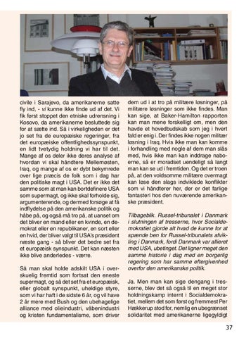 dem ud i at tro på militære løsninger, på militære løsninger som ikke findes. Man kan sige, at Baker-Hamilton rapporten kan man mene forskelligt om, men den havde et hovedbudskab som jeg i hvert fald er enig i. Der findes ikke nogen militær løsning i Iraq. Hvis ikke man kan komme i forhandling med nogle af dem man slås med, hvis ikke man kan inddrage naboerne, så er moradset uendeligt så langt man kan se ud i fremtiden. Og det er troen på, at den voldsomme militære overmagt kan løse den slags indviklede konflikter som vi håndterer her, der er det farlige fantasteri hos den nuværende amerikanske præsident. Tilbageblik. Russel-tribunalet i Danmark i slutningen af tresserne, hvor Socialdemokratiet gjorde alt hvad de kunne for at spænde ben for Russel-tribunalets afvikling i Danmark, fordi Danmark var allieret med USA, ubetinget. Det ligner meget den samme historie i dag med en borgerlig regering som har samme eftergivenhed overfor den amerikanske politik. Ja. Men man kan sige dengang i tresserne, blev det så også til en meget stor holdningskamp internt i Socialdemokratiet, mellem det som først og fremmest Per Hækkerup stod for, nemlig en ubegrænset solidaritet med amerikanerne ligegyldigt