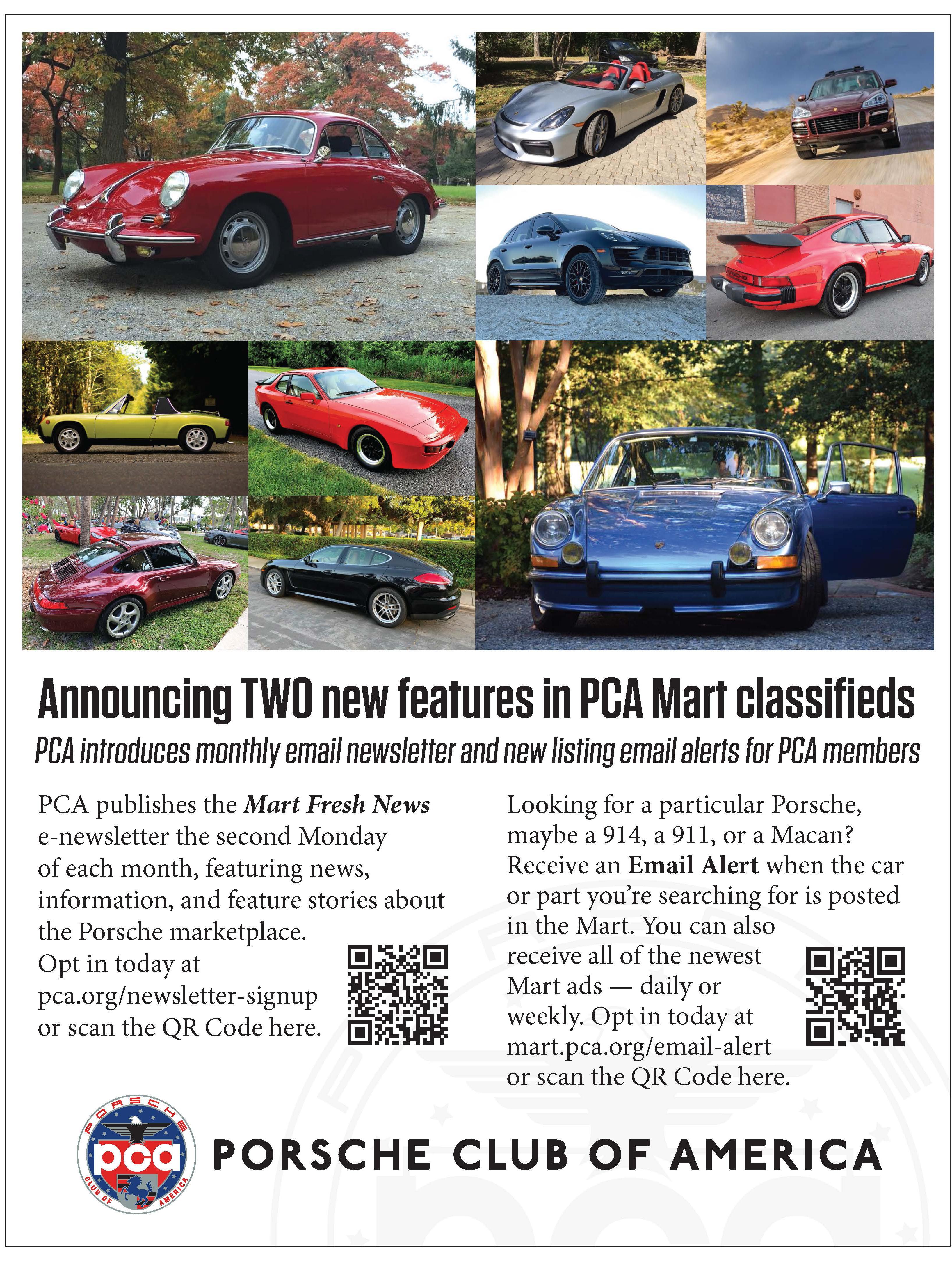 You will be seeing a few additions to our Coastalaire publication, starting with this issue. We now have a Porsche market update in every issue from David K. Whitlock, a fellow PCA member who has a daily online market newsletter you can sign up for. In addition, he is related to our very own Hamp and Sue