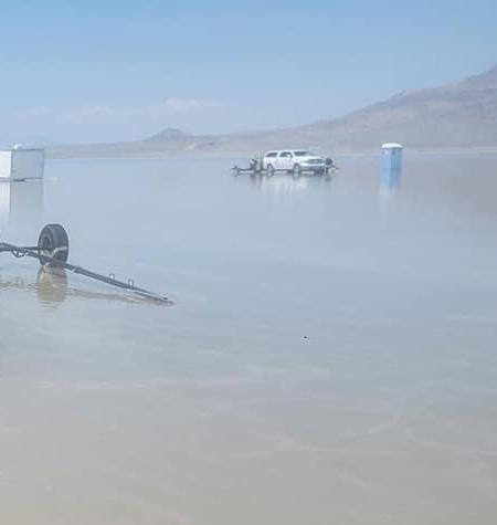 Sunday morning dawned clear and sunny, but a notice was put out that the event had been cancelled due to flooding of the salt flats. The car owners called me and said we were going to go out to the pits and load up the race car. When we arrived at the Salt Flats, it was totally flooded and there was about four inches of water at our pit area. We took off our shoes and socks, rolled up our pants, put on some cheap flip-flops we bought at the Dollar Store and waded out to load up the race car and pack up to leave.