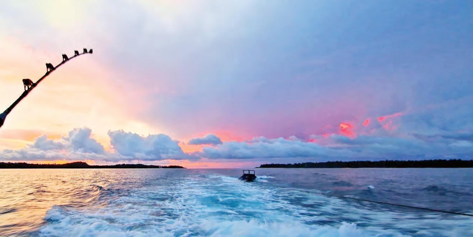 Be prepared for mahi when heading ofshore in summer. Keep at least four rods designated for working a school and more for trolling. J hooks are a must for these head-shaking, sky-rocketing, fippy-fappy, squirm-fsh, but just about any line and bait will do. Tese tasty little dummies aren’t picky and would strike a banana peel if you jigged it right. Tat said, the speed of the bait is a variable you might have to adapt to. Teir toddler mentality kicks in when you try to take a bait away from them, encouraging them to strike something they just turned their nose up at. If you get hit when reeling in your bait, open your bail and give them a chance to eat.