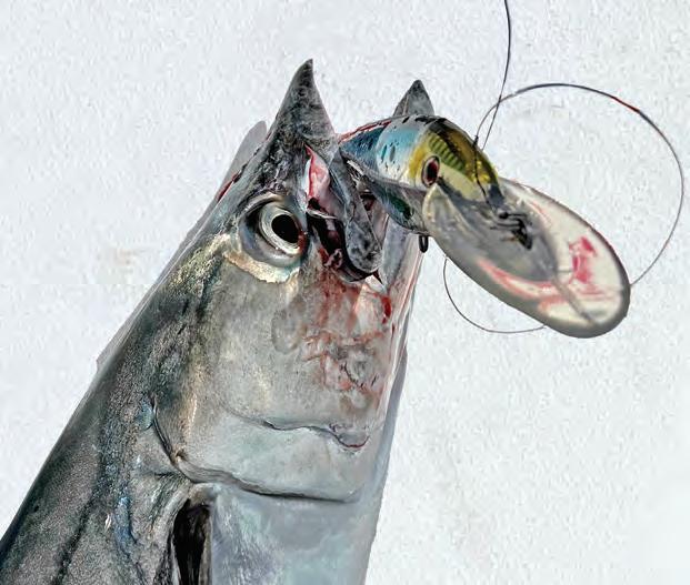 start with a shallow runner like the Nomad 190 AT that runs 3 to 5 feet deep, which I set way back. I also like the Nomad Madmacs that run just slightly deeper. I run it 30 to 50 feet in front of my shallow long-bait to facilitate turning. Ten I like to go deeper with a DTX Minnow 165. I run that close to the boat and right under the prop wash. Tis is hands down my most productive bait. I fnd speeds of 6 to 8 knots usually work well. Tis allows me to cover a lot of ground and is fast enough to elicit a strike. I ofen fnd any slower and the fsh don’t seem interested. Te other great thing about these lures is the hooks are very large, and they stick once they make contact.