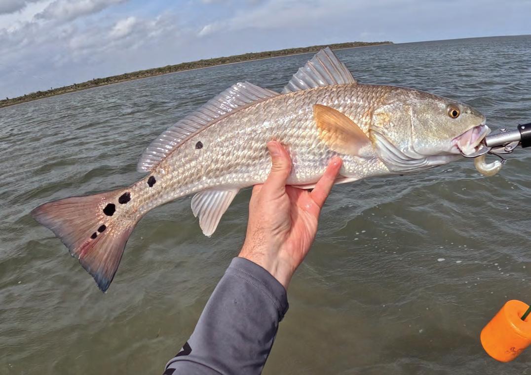 ourselves. We were drifing in an open area near a river mouth in 10 feet of water. Te captain yelled, “there they are!” and hurriedly encouraged us to reel in our lines before heading full throttle toward the middle of the bay. We all looked at each other, “What did he see?” We still didn’t see anything, no disturbed water, no bait jumping, no diving birds. Ten he said, “Cast over there!” and we all three hooked up on big redfsh before our sof plastics reached the bottom.
