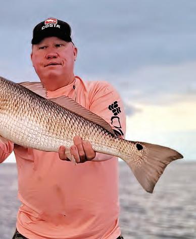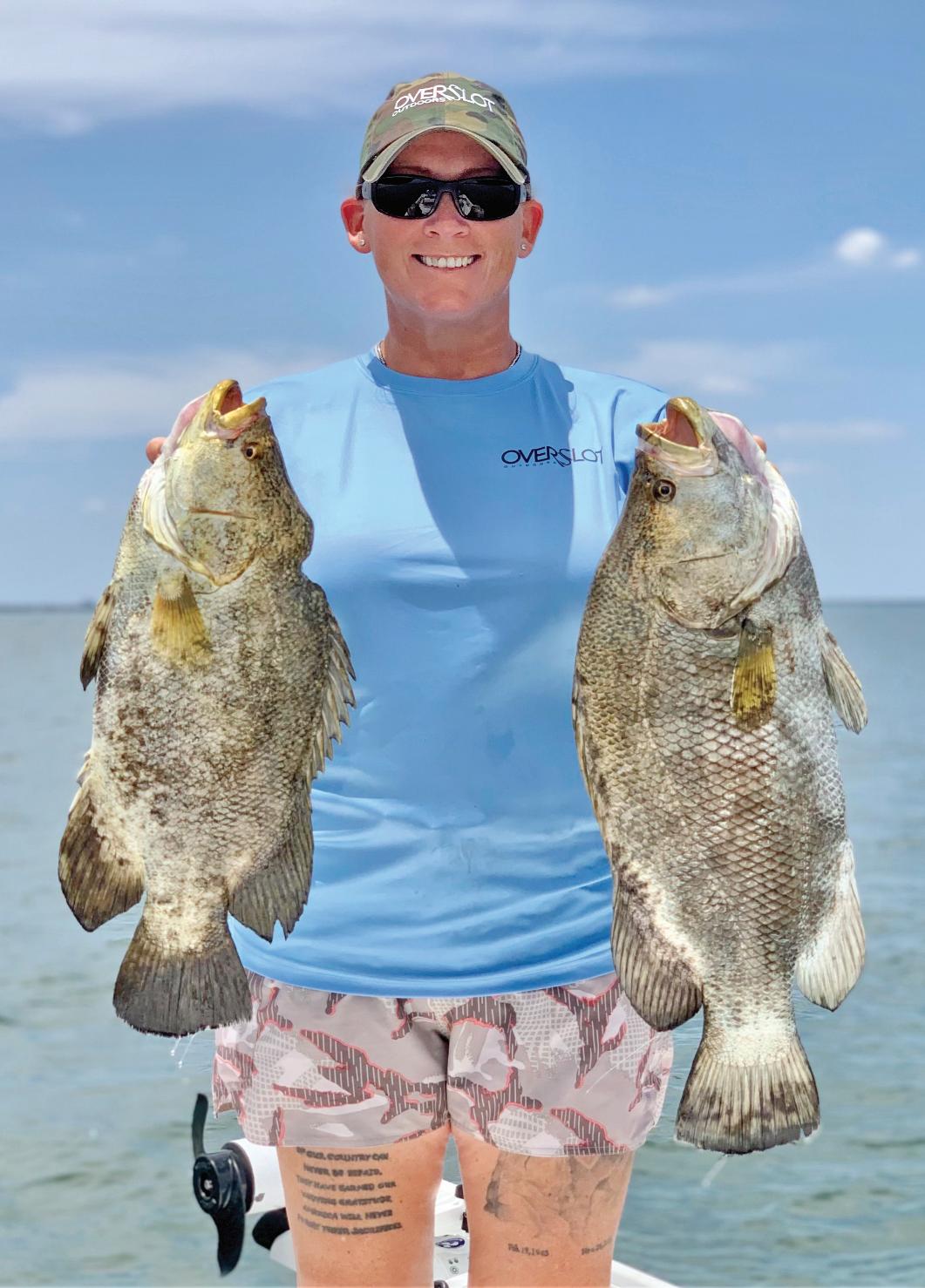 e days were hot, in the low to mid 90s with pop-up thunderstorms every day. One day we even spotted two waterspouts. We did our best to dodge all that, but we did get wet a few times. e last 30 minutes of daylight were always the most productive. We shed rock walls and hooked up several big red sh each evening. Mixed in with the red sh were some giant sheepshead that fell for the same tactics as the reds. Blue crabs are everywhere. You can catch them with a long-handle dip net or rod and reel.