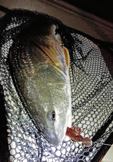 All joking aside, I believe the best bite for older, wiser, heavily pressured fsh is at night. Tey’re a little more at ease afer the sun goes down and the boat trafc lets up. Tis is when the big girls let their guard down and come back into shallower water to feed. Wherever you fnd shrimp and small mullet along the edges is a good place to take advantage of aggressively feeding redfsh, trout or snook afer dark. Te patterns are similar for all of them.
