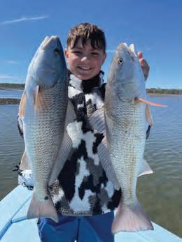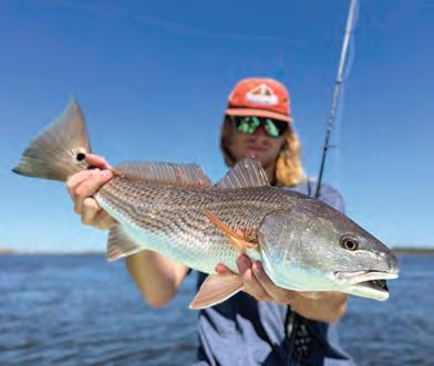 cork rather than changing color. Known for their e ectiveness when using live shrimp, popping corks also improve the performance of so plastics. Depending on the situation and preference, these can be used on a jig head, weedless weighted hook, or with just a hook. When choosing a popping cork, I like a deep cup, which is hard to !nd on most corks in today’s market, but there are a few. Most manufacturers went away from the actual reason for the name, popping. e original, and a few out there today, still have the deep concave top, which produces the slurping sound and splash mimicking a !sh feeding on the surface. I !nd that sound is what attracts the !sh more than a clack. I’ll dedicate an entire article to cork !shing and the many ways to use them soon. While targeting reds, use a stout hook on your jig head. A hook you can $ex with your !nger is better suited for trout than reds. is is not where you want to skimp on quality. Not only do the hooks need to stand up to the hookset into the thick skin of a red, but they also need to hold up to the torque of removing the hook from the their jaw. I see many hooks get destroyed at this point. ank you for reading my words and don’t forget to take a kid !shing! e time is right.