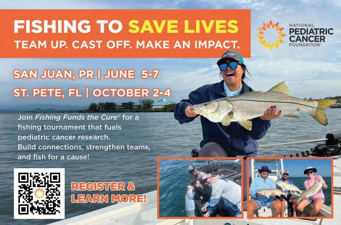 The National Pediatric Cancer Foundation (NPCF) created “Fishing Funds the Cure” to raise awareness and funds for crucial research. Each year, they unite corporate partners, passionate anglers, and dedicated supporters for Fishing Funds the Cure Tournaments through an activity that everyone loves. ese exciting inshore and freshwater shing tournaments are held in beautiful locations like St. Pete Beach and Sarasota, Florida, San Juan, Puerto Rico, and more. Each event, thoughtfully designed to engage supporters, features a kick-o celebration, angler swag bags, an awards dinner and a silent auction, all dedicated to making a meaningful impact.