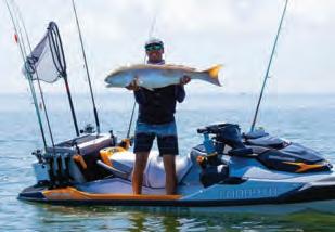!is is a great time of year to catch that African pompano of a lifetime in 150- to 250foot range as they are ready to break up into smaller schools for spawning. Again, I like a squid-type jig because it is the primary food source for the African pompano. It is the bulk of their diet according to the experts. And it’s not just African pompano; everything out there, without exception, eats a squid. !is is a great way to catch big snappers as well. Pull up to where the marks are, make a dri$ and repeat as o$en as needed. A trolling motor upfront can slow the dri$ nicely, keeping your boat forward in the wind with the kite bait or %oat, and baits behind the boat very manageable.