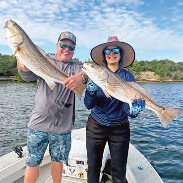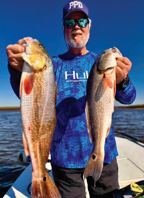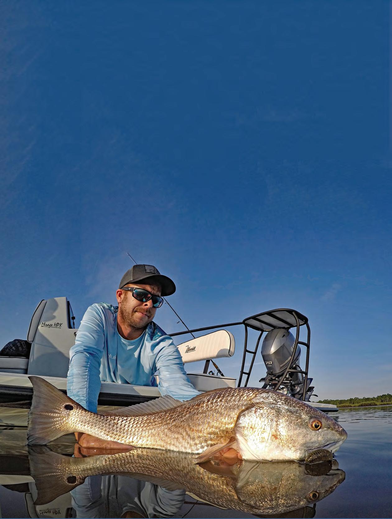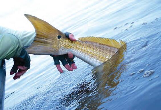 Red!sh will be my primary target since I spent the winter targeting trophy trout. As always, bait will be the key to a successful outing. Since the size of the bait will be small, I like to have two characteristics in my lure. ey are small, roughly 3”, and have a clear sparkling color. is helps produce in most situations because the bait is tiny, maybe smaller than my lure. at is why I like the transparent re$ective colors; they disguise the lure’s size, making it appear smaller.