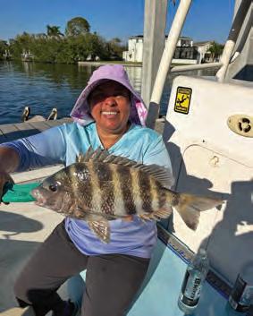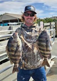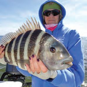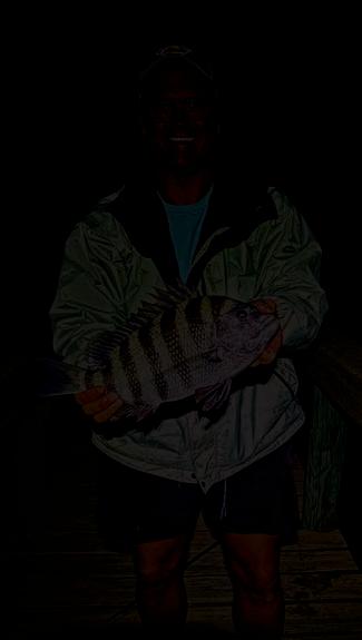 20-pound test braided line and a 25-pound test fluorocarbon leader, and secured with a loop knot to a 1/0 hook. A Texas rig setup is recommended, with the sinker positioned on the leader just above the hook. Incorporating a small glow soft bead can prevent the sinker from contacting the knot and may help attract larger fish. Sinker weight should be selected based on water depth and tidal movement, be ginning at 3/8 oz. and increasing up to 1 oz., as conditions require. Lighter weights enhance bite detection, while insufficient weight may cause bait to drift off the bottom reducing opportunities for sheepshead to locate and consume it.