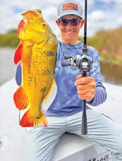 To cover more water and locate active sh, I switch to a big speed worm. While it’s a popular technique in Florida, where I predominantly sh, it works well across the country. !e bait’s vibration drives bass crazy, making it an excellent search tool. Once I nd sh with this method, I slow down and ne-tune my approach with other techniques. For stained water, I like darker colors like junebug; for clearer water, I use green pumpkin with ake. Weight ranges from 1/8 to 1/4 oz depending on depth and wind. Fluorocarbon in the 15–17 lb range is ideal here too.