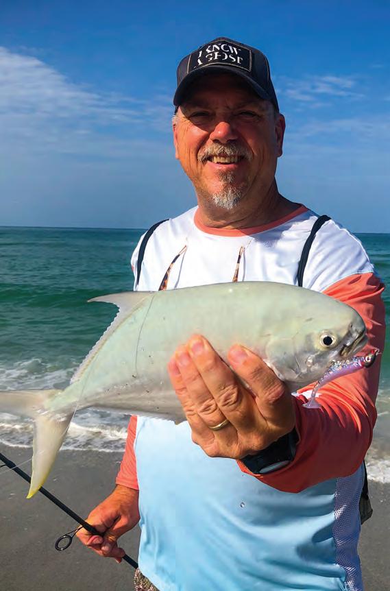 Temperature drives the movements of these tasty little jacks. ey prefer 70- to 80-degree water temps, they travel in schools and feed on mollusks and crustaceans in inlets and o sandy beaches. ese are some of the reasons pompano are a favorite target of shore-based anglers. Once you nd them, you are in for a world of fun.