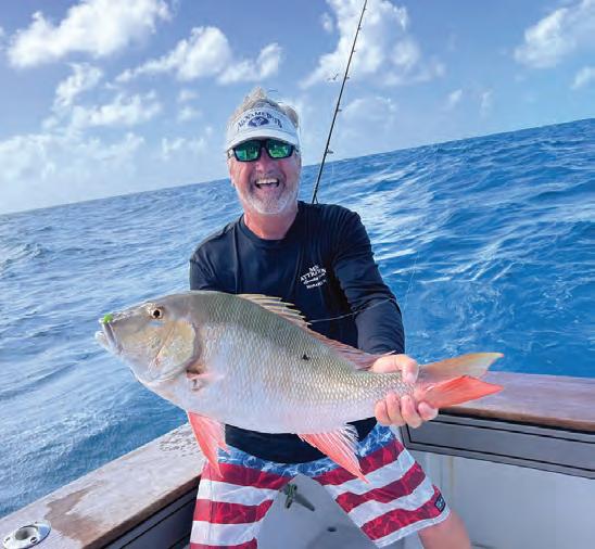 Christmas week, in my opinion, is the peak of bottom shing season, and there are plenty of reasons why. One of the biggest factors is the congregation of bait schools, like cigar minnows and sardines, which are some of the best baits available. Other reasons include the spawning aggregations and the cooler water temperatures. Speaking of bait, grouper (and American red snapper) can’t resist a few others if presented right: pin sh, sailor’s choice, and even small beeliners and other little snappers. !ese baits are so tempting because larger sh like grouper and snapper see them as egg-eaters. !ey devour them not only as a food source but also to protect their future o spring from these egg thieves. If you present these baits correctly—and avoid using bulky tackle— they’re simply too enticing to resist.