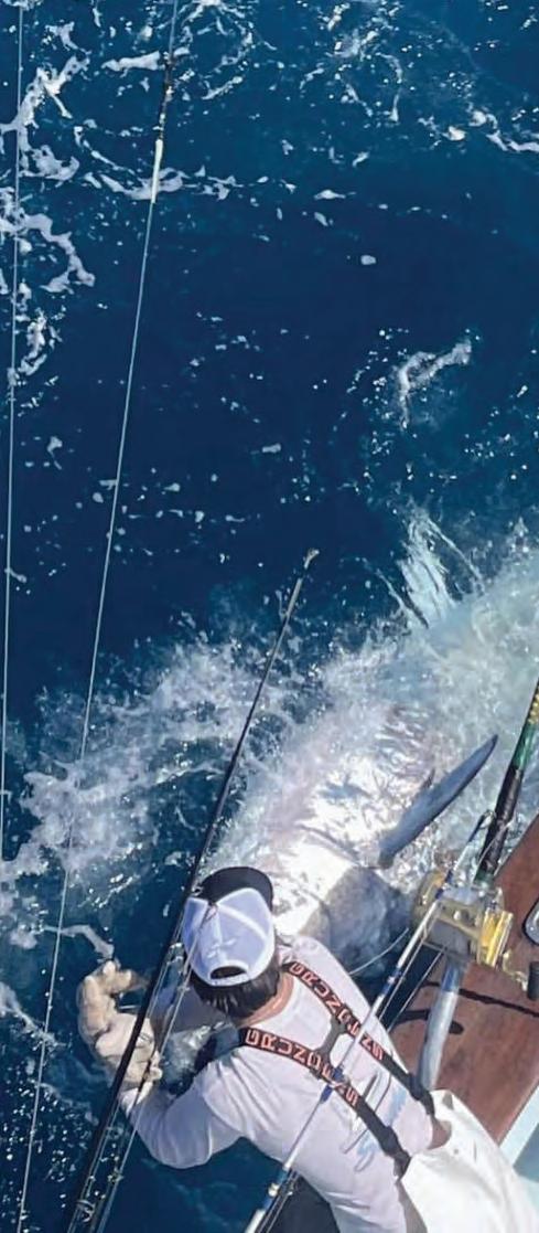 I fsh early mornings, as tuna can be both light and boat shy. During a full moon cycle, the bite can turn of quickly as the fsh have been feeding most of the night. Once on my target area, I set up for a drif just outside the frst reef system, past the drop-of in deeper water to avoid bonito, sharks and kingfsh. Tis is typically in the 225- to 300-foot range. I deploy two live baits—one in the bow and the other in the stern—then jig in the middle. Check your fshfnder ofen to identify “scratches,” or fsh moving through, and mark the depth they appear in the water column. Target these fsh while jigging.