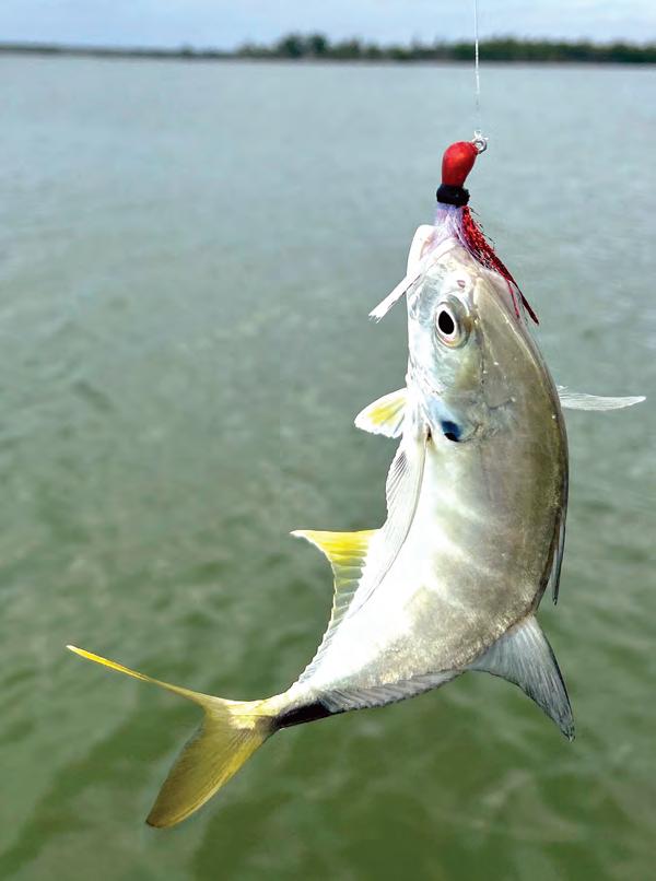 TECHNIQUE: Identify the feeders. Bluefsh, jacks, mackerel, ladyfsh, kingfsh and barracuda are all aggressive feeders that like fashy lures and fast retrieves. If you’re fshing for tarpon, a slow steady retrieve is better. Snook will hit a slow retrieve and can also be caught in shallower water by jigging of the bottom around the frst cut. Whiting, pompano and croakers are all easily caught twitching a lure of the bottom, but you must get it out to them.