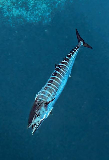 start with a shallow runner like the Nomad 190 AT that runs 3 to 5 feet deep, which I set way back. I also like the Nomad Madmacs that run just slightly deeper. I run it 30 to 50 feet in front of my shallow long-bait to facilitate turning. Ten I like to go deeper with a DTX Minnow 165. I run that close to the boat and right under the prop wash. Tis is hands down my most productive bait. I fnd speeds of 6 to 8 knots usually work well. Tis allows me to cover a lot of ground and is fast enough to elicit a strike. I ofen fnd any slower and the fsh don’t seem interested. Te other great thing about these lures is the hooks are very large, and they stick once they make contact.