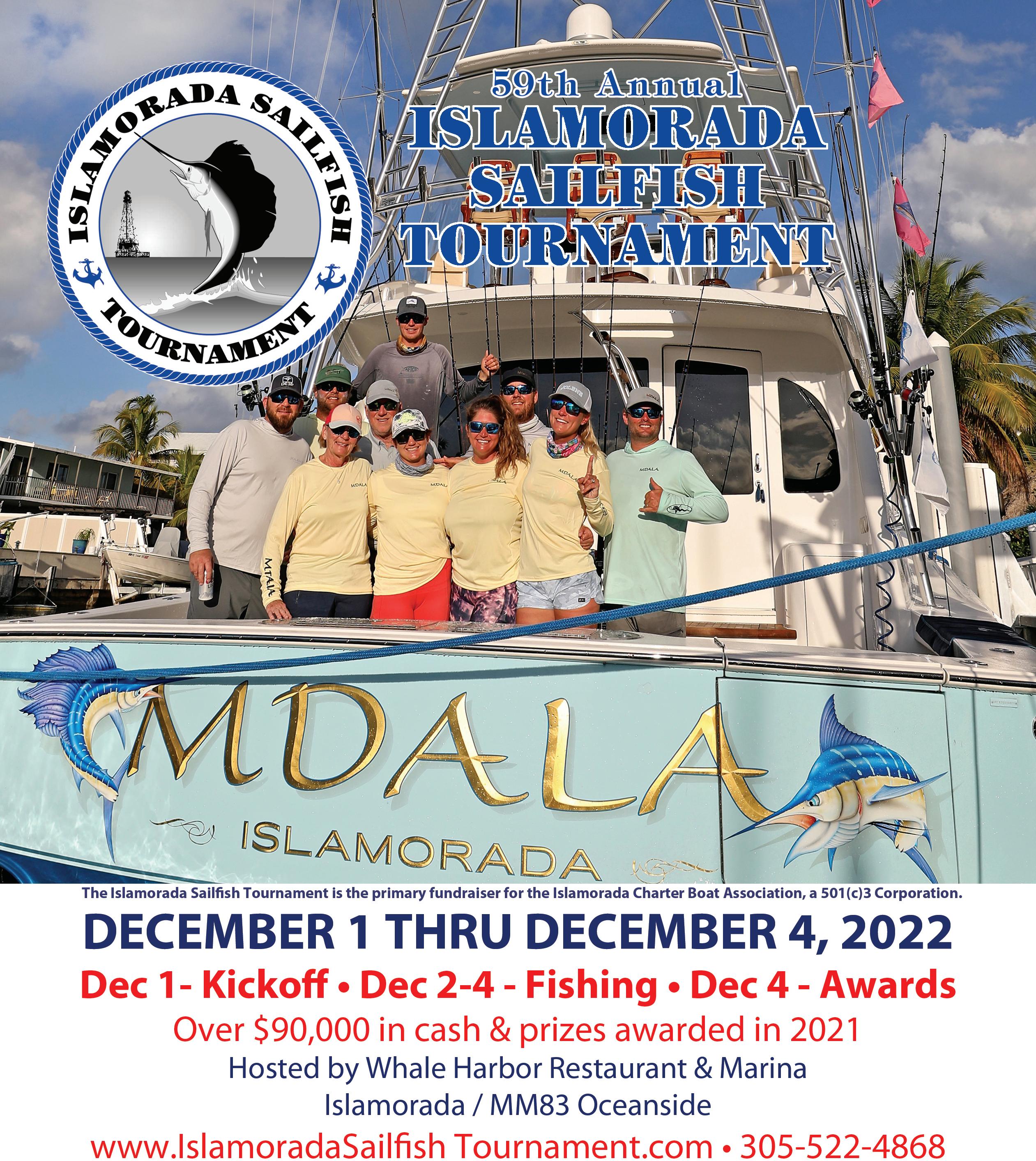 The Florida Keys ONLY Tournament Series IslamoradaTournamentSailfish Dec. 1 Kick Off Dec. 2-4 Fishing Dec. 4 Awards Islamorada Fishing Club TournamentSailfish Jan. 17 Kick Off Jan. 18 Fishing Cheeca Lodge & SpaTournamentPresidential Jan. 20 Kick Off Jan. 21 & 22 Fishing www.islamoradasailfishtournament.com Call Dianne Harbaugh for more information at 305-522-4868 Gold Cup Awards Banquet • Jan. 22 F lorida K eys G old C up s eries I S LAMORADA SAILFI S H TOURNAMENT