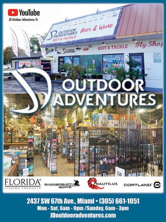 This time of year, water temperatures will vary a lot with cold fronts moving in for a couple days before it’ll start getting back to our hot South Florida temperatures. With the drop in water temperature, I’m usually shing ¼ oz jig heads rigged with a live shrimp or 3 in gulp shrimp on the bottom. e size of the jig will vary depending on the current speed and water depth. You’ll nd me shing creek runo s, deep channels with good moving water and deeper mangrove points with moving water as well. Depth and moving water is the key with these water temperature drops. ese areas will hold a warmer temperature than surrounding areas. is will keep the sh a little happier and in a willing state to feed. In these channels and creeks, we are targeting anything from snook, red sh, seatrout, black drum, snapper and sheepshead. Another thing I do with my clients during this time is sh just west of Schooner Bank for the schools of spanish mackerel that are out in the Gulf. A 1/16 oz long shank jig head or 2/0 longshank hooked with a shrimp, a bucktail jig, silver spoon, or gotcha plug will all do the trick. Once anchored, I like to put out a chum block to put some scent in the water to bring the sh in. Once you bring them in close, it’s typically one on every cast!