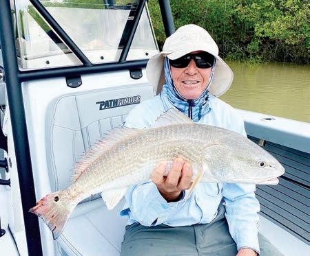 When water temperature stabilizes in the COLD range, all the migratory forage ees for warmer pastures. e bays are le with larger mullet as the primary food source for prized speckled trout. is is the time of year that I pull out my larger lures. is could be a longer length, a wider pro le, or both. is doesn’t have to be a 12-inch lure that is no fun to cast all day, but I do upsize from my typical 3- and 4-inch lures that I use most of the year. We have all seen a 25-inch trout with a 15-inch mullet in its belly, so they will eat something huge, but giant baits aren’t as fun to sh.