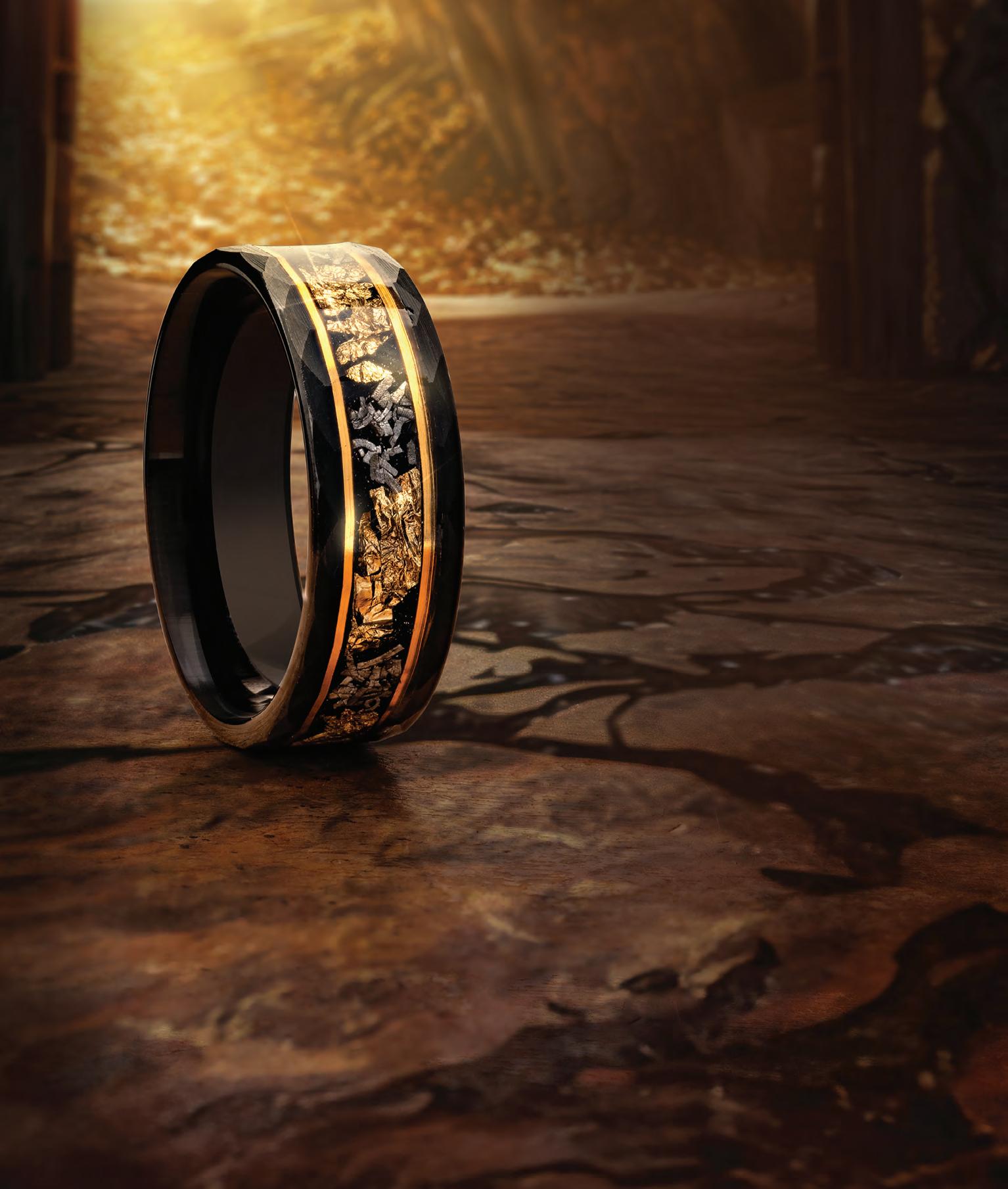 • 24k gold embedded in black-finished tungsten