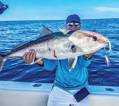 Check your sonar screen frequently and look for “scratches” or fsh feeding in the water column. We usually assign one person to call out depth changes along with depth of marked fsh. Tuna can be found from 250 feet up to the surface. Highspeed cruisers like wahoo and kingfsh prefer the upper 50 feet of water, while amberjack will be close to structure. Jigging and adjusting depth to target fsh is more efcient under electric power, and the most difcult part of the electric game is picking the right equipment that works together.