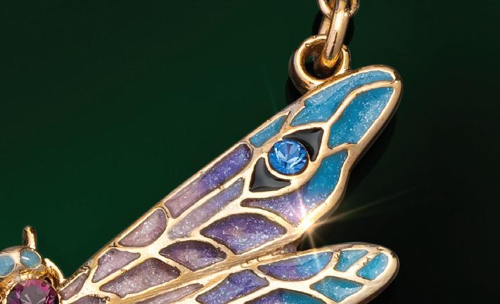 True artisanship in Austrian crystal and yellow gold. is necklace and earring set features gorgeous multicolored enamel paired with Austrian crystals and a yellow gold nish. Ask any jeweler and they’ll tell you it takes true artisanship to properly blend the blues and purples found in this enamel. While art nouveau dragon ies are hard to come by, we’re helping to repopulate their numbers with this artfully stylized depiction of some of nature’s smallest wonders!