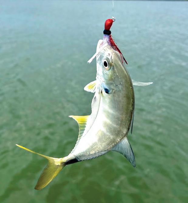 TECHNIQUE: Identify the feeders. Bluefsh, jacks, mackerel, ladyfsh, kingfsh and barracuda are all aggressive feeders that like fashy lures and fast retrieves. If you’re fshing for tarpon, a slow steady retrieve is better. Snook will hit a slow retrieve and can also be caught in shallower water by jigging of the bottom around the frst cut. Whiting, pompano and croakers are all easily caught twitching a lure of the bottom, but you must get it out to them.