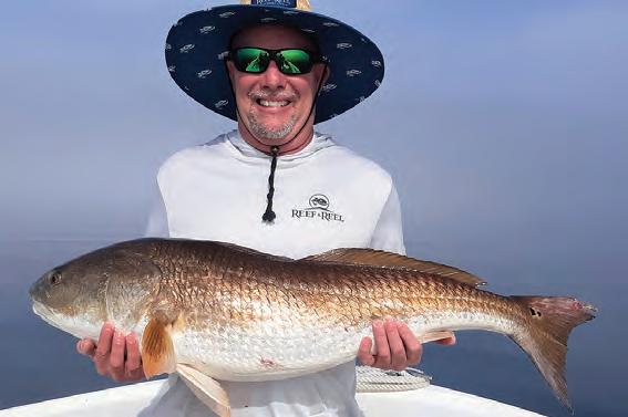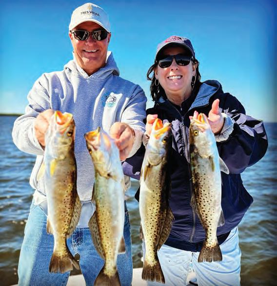 When water temperature stabilizes in the COLD range, all the migratory forage ees for warmer pastures. e bays are le with larger mullet as the primary food source for prized speckled trout. is is the time of year that I pull out my larger lures. is could be a longer length, a wider pro le, or both. is doesn’t have to be a 12-inch lure that is no fun to cast all day, but I do upsize from my typical 3- and 4-inch lures that I use most of the year. We have all seen a 25-inch trout with a 15-inch mullet in its belly, so they will eat something huge, but giant baits aren’t as fun to sh.