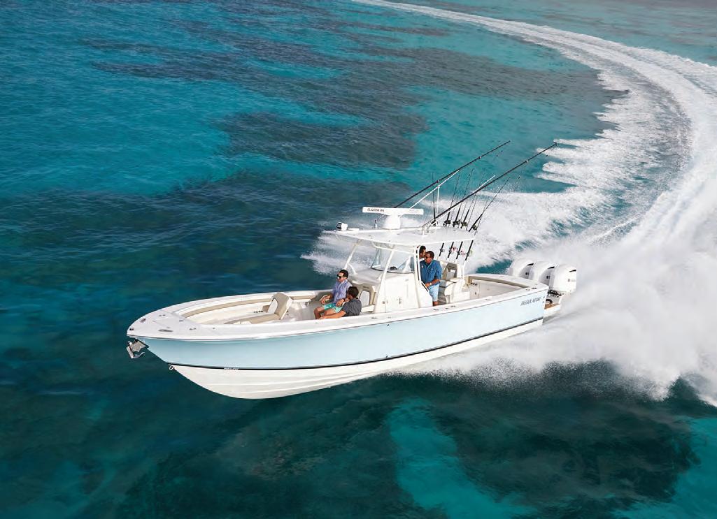 At their core, C-Hawks are hardcore workhorses, and the center console models have become popular with charter captains because they are built to withstand hard use for years of trouble-free boating. Grubbs pointed to C-Hawk’s 25 CC as a great example of what the brand has become. It’s an extremely stable fshing platform that drafs just 12 inches, and with a 300 horsepower max it’ll take you anywhere you need to go from skinny water to light ofshore duty. What’s more, it’s infnitely customizable from the factory.