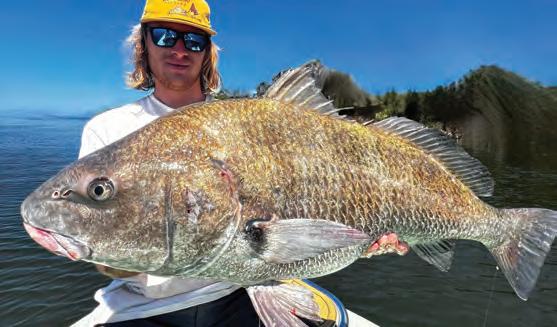 Te tactics are the same and simple. Tey will eat dead or live bait in most cases. Tat said, I found a combination of the two to be the best bet. I like to start with “stinky bait.” Dropping some frozen squid or menhaden is a great way to get the bite going. Once the bite starts, which is usually quickly if they are around, I like to switch to palm-size live pinfsh to entice the bigger fsh. While dead bait and jigs will certainly get you keepers, the larger fsh are quicker to hit a live bait.
