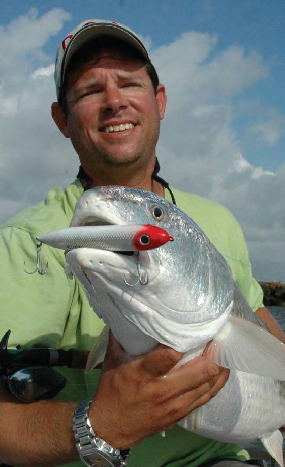 GEAR: I recommend a good spinning reel with a 9- or 10-foot rod for longer casting. I use braided line because it’s strong and the smaller diameter of the line is better for casting. I use 6to 10-pound braid most of the time with 2-foot fuorocarbon leader. I use a 25-pound leader but have used 20- to 40-pound leaders in diferent situations. Carry extra leaders and lures in case your line breaks.
