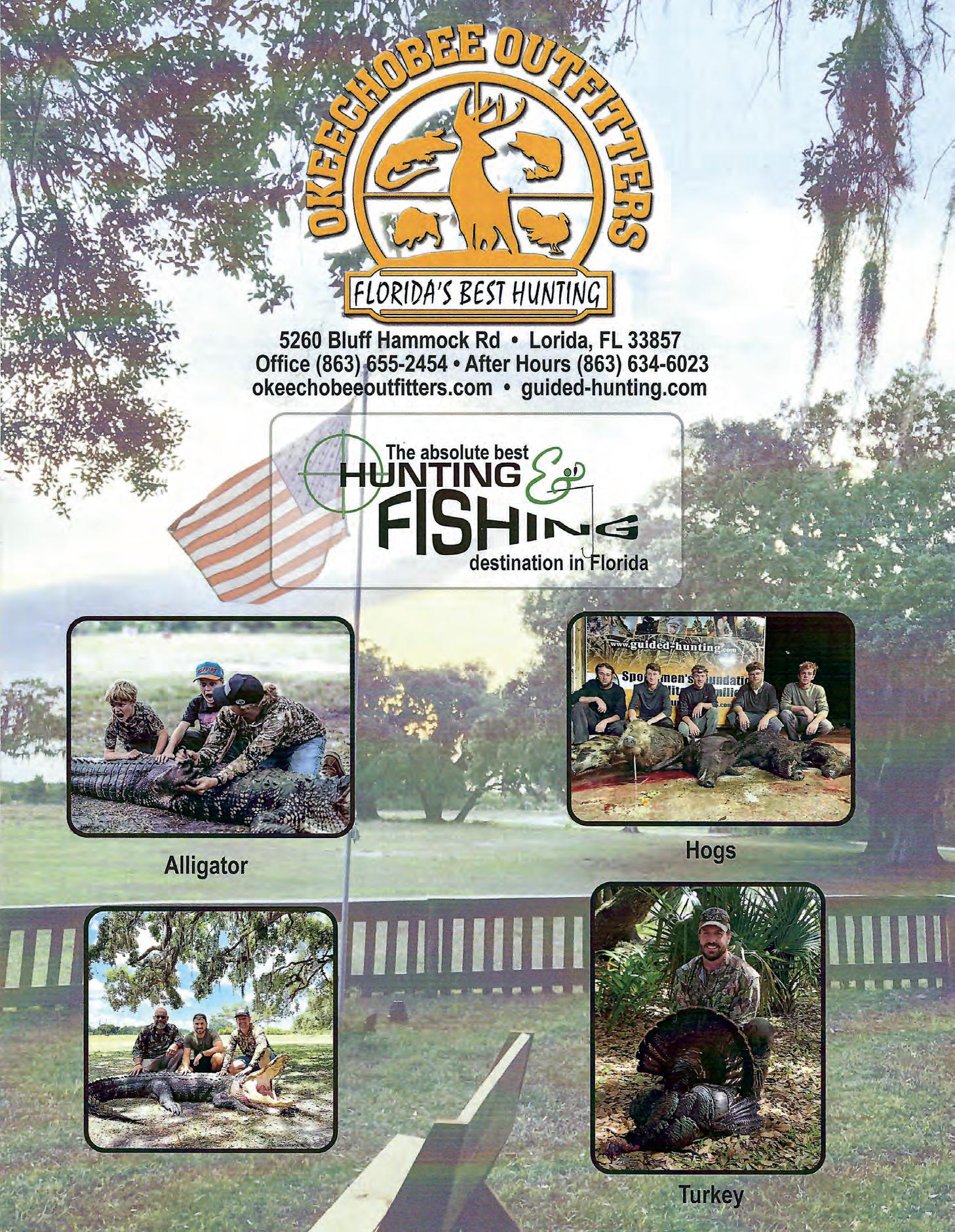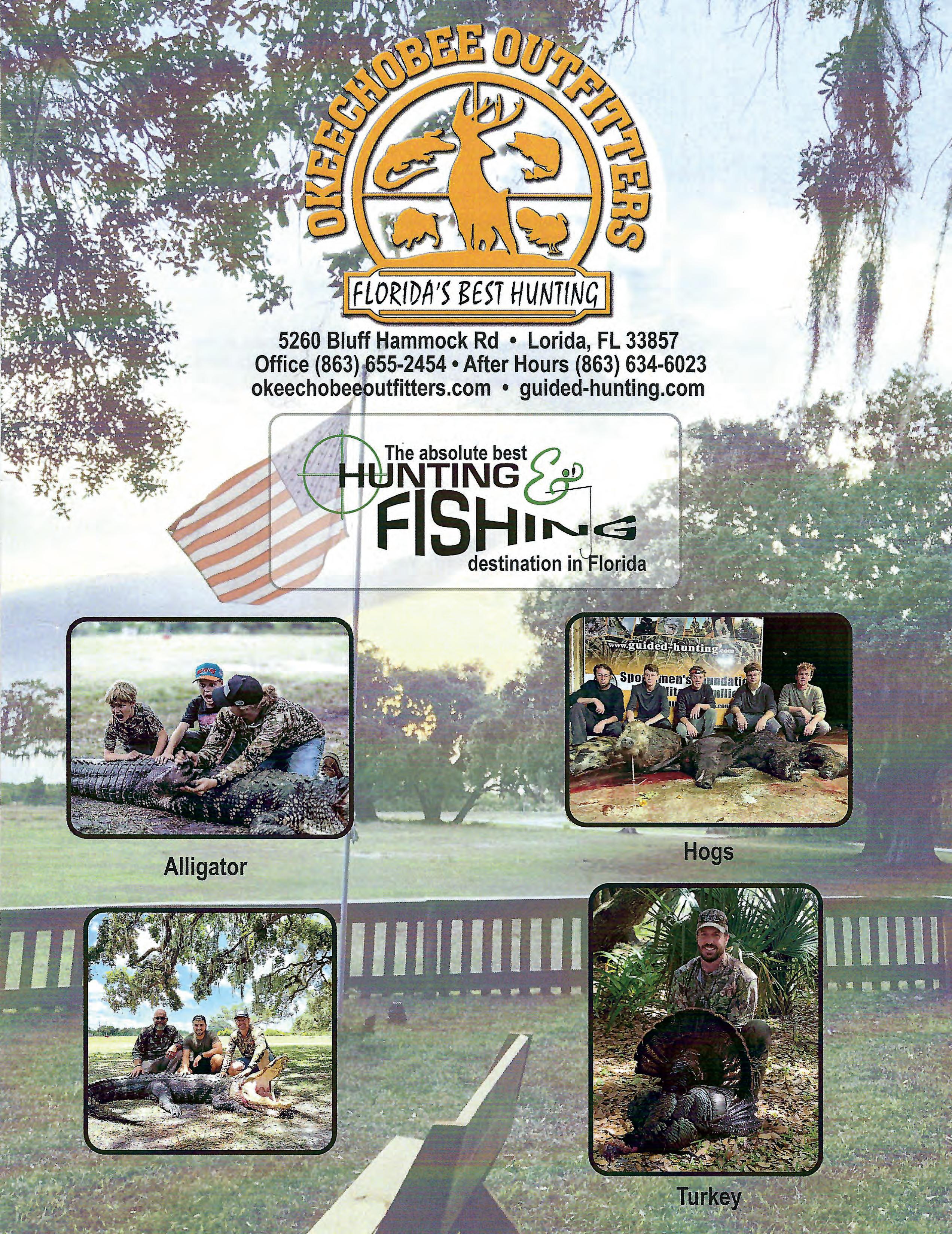 Located on 2,000 acres of Florida bays, pines, palmettos, and oaks, outside the small town of Lake Placid, the Lightsey Family Ranch is perfect for the avid hunter and outdoorsman. Owner and lifelong hunter, Lee Lightsey, offers you to a one-of-a-kind hunting experience, including wild hog, quail, pheasant, turkey, deer, and alligator hunts. During your hunt you are welcome to stay at our lodge which features room for up to 28 guests, a large lobby with a true old Florida feel, and a full time Chef ready to prepare your meals.