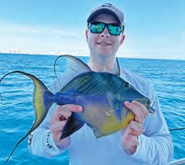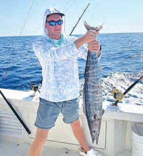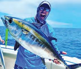 Tere are many ways to target blackfn tuna. I like to drif fsh for them with whatever bait is prevalent and available, whether it’s blue runners, sardines or threadfns. A typical spread for drifing might include two weighted downlines—one for the middle of the water column and one deeper— and a couple of freelines, one on each corner. Kites are another great way to present baits on the surface. With a spread like this, you’ll cover the water column from top to bottom and have a good chance of putting baits in a school of hungry blackfns. If you don’t love live bait, slow-pitch jigging around reefs is also an option. Either way, you never know what else you’ll catch while fshing for tuna.