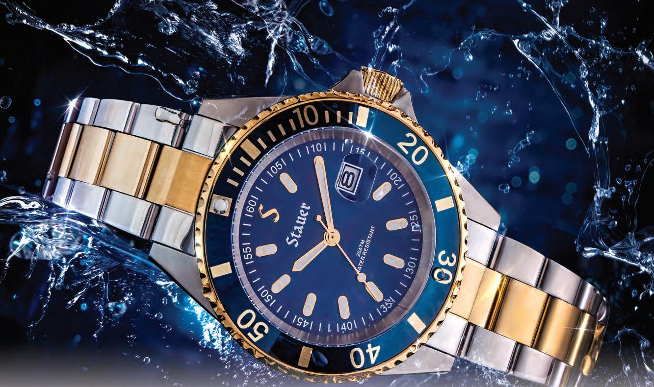 •Precision movement • Stainless steel crown, case, caseback and bracelet • Date window at 3 o’clock •Water resistant to 20 ATM • Bracelet fits wrists up to 8 1/2" Explore the Depths in Style For Only $99 PRAISE FOR STAUER DIVE WATCHES êêêêê