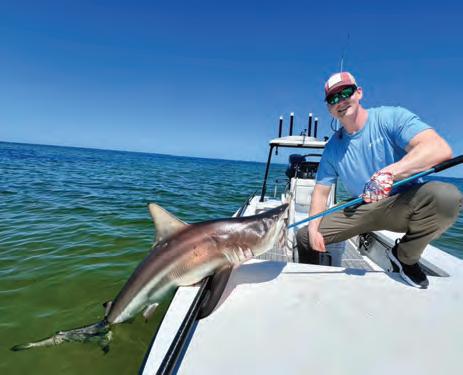 I’ve never seen as many sharks as we are seeing right now. Te bottom is covered with them, and the top layer of the water column is full of them. Tis past trip, we put out fve Spanish mackerel on light lines hoping for a wahoo bite. We caught fve sharks almost instantly. One of these bites was the biggest tiger shark I’ve ever seen. It was at least 12 feet long and 2 feet wide across the head. Te rest of them were standard 6- to 9-footers; it takes a toll on you to get them to the boat for dehooking.