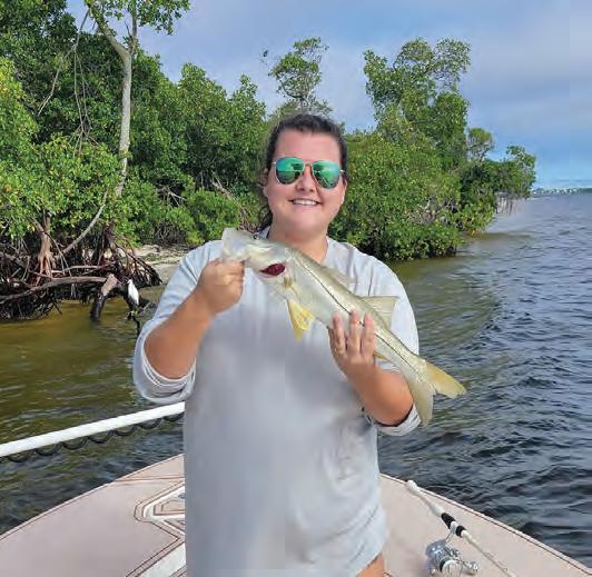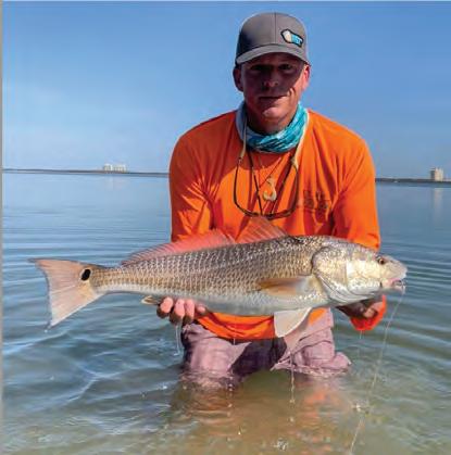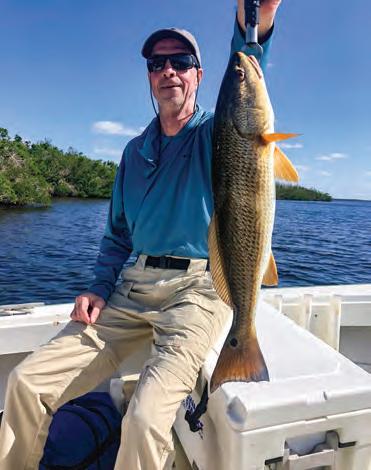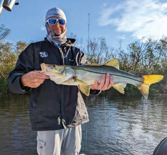 When water temperature stabilizes in the COLD range, all the migratory forage ees for warmer pastures. e bays are le with larger mullet as the primary food source for prized speckled trout. is is the time of year that I pull out my larger lures. is could be a longer length, a wider pro le, or both. is doesn’t have to be a 12-inch lure that is no fun to cast all day, but I do upsize from my typical 3- and 4-inch lures that I use most of the year. We have all seen a 25-inch trout with a 15-inch mullet in its belly, so they will eat something huge, but giant baits aren’t as fun to sh.