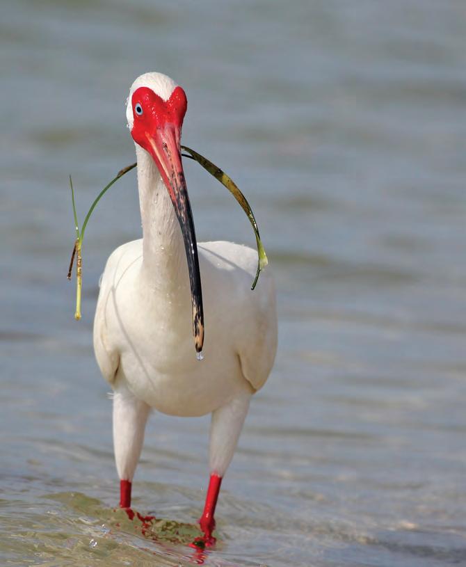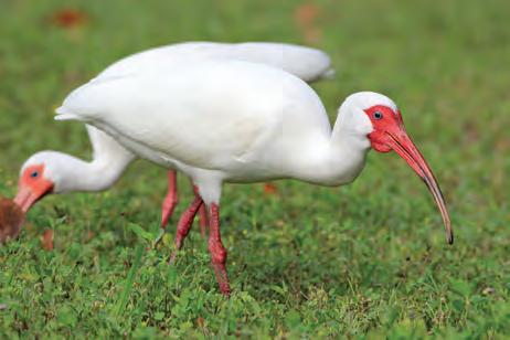 The White Ibis is often called the “hurricane bird.” It’s considered the last bird to leave on a hurricane’s approach and the first species to return to storm battered areas. This is why the mascot of the University of Miami is the White Ibis. White Ibises stand between 23” and 27” tall. Their long, downward turned, orange bill is their easily identifiable feature. They use that orange bill to probe into the ground to find their prey. You can usually find them in wetland areas near both fresh and salt bodies of water. Ibises eat everything from insects to reptiles and crustaceans. Small snakes and frogs seem to be a favorite meal, and other Ibises often try to steal the prize when one bird finds one. Juvenile White Ibises are brownish gray with pinkish bills and will slowly gain their white feathers over time. Look for them in small flocks of about 5 to 25 birds flying overhead, or probing the soil in your local parks, or maybe even, in your yard!