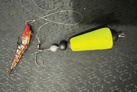 has two sound producing beads and a weight that increases my cast during windy days. Also, the beads create the sound of a wounded bait. The clarity of the water dictates the size of my leader--anywhere from 15 to 30-pound fluorocarbon. I work the float with a popping action to draw attention to my bait and the float. Over the years, I’ve noticed that my float had chunks missing from the trout attacking the float like a top water bait, so I put a small split ring where the swivel meets the float wire and add a 2/0 hook. I started catching two trout at a time. This method can be used with live bait or, as the picture shows, artificial bait.