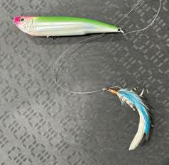 set at about eight inches, and I tie on a mid-running fly. The action of the plug draws attention, and the tailing fly becomes the easy prey for the fish to hit. In some cases, I have caught two fish at the same time.