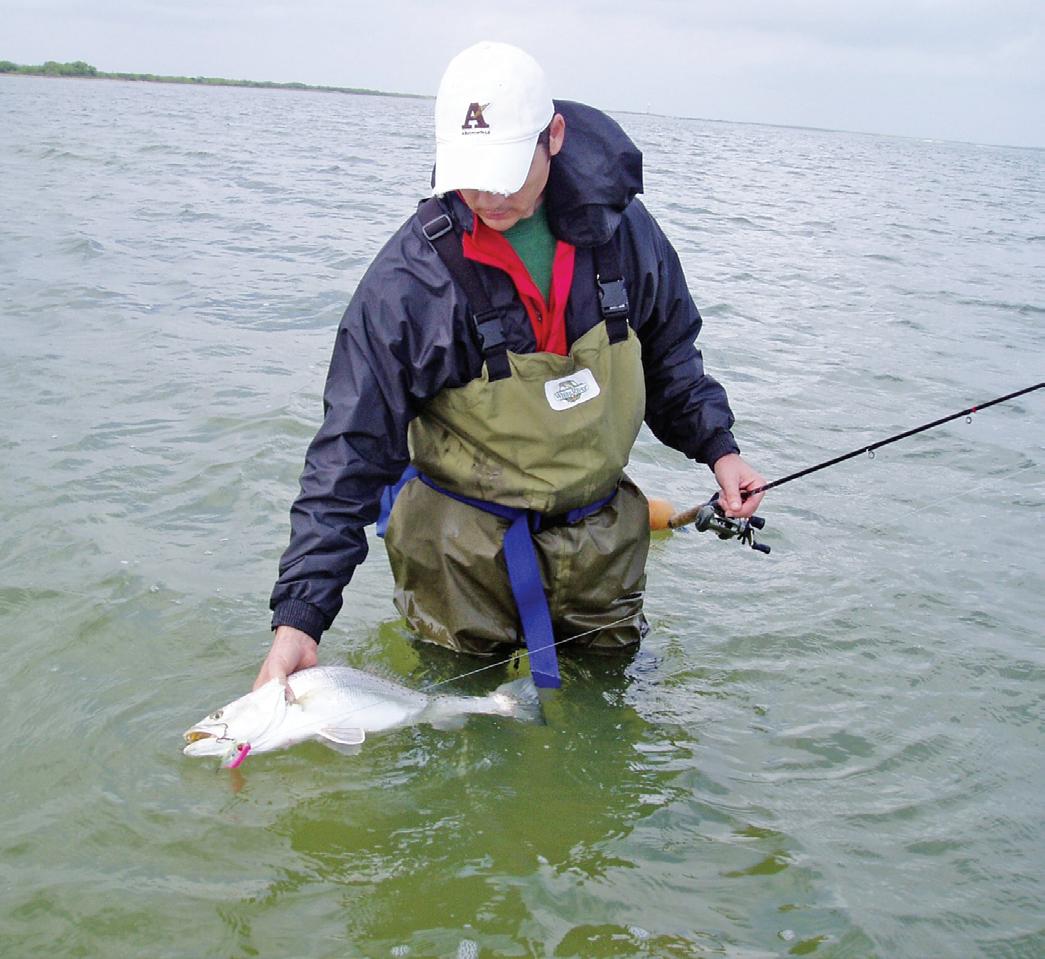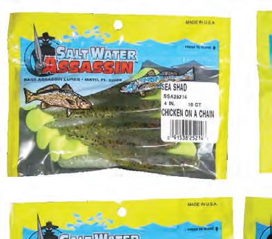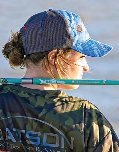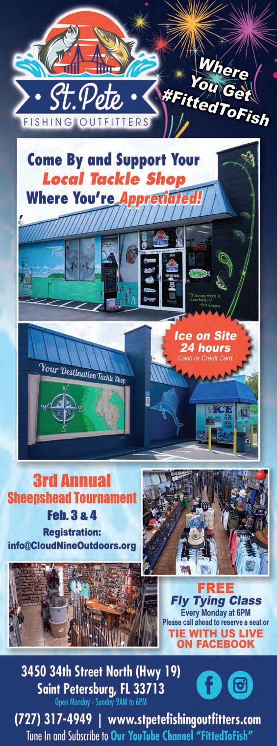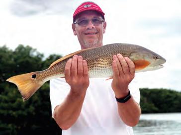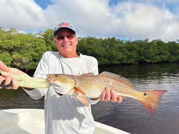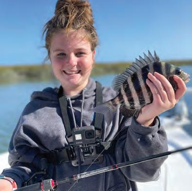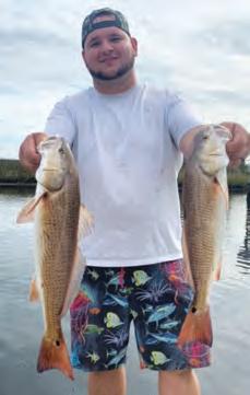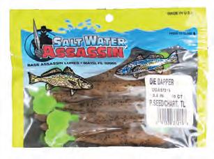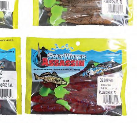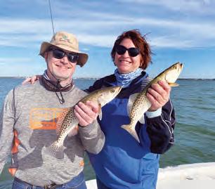 When water temperature stabilizes in the COLD range, all the migratory forage ees for warmer pastures. e bays are le with larger mullet as the primary food source for prized speckled trout. is is the time of year that I pull out my larger lures. is could be a longer length, a wider pro le, or both. is doesn’t have to be a 12-inch lure that is no fun to cast all day, but I do upsize from my typical 3- and 4-inch lures that I use most of the year. We have all seen a 25-inch trout with a 15-inch mullet in its belly, so they will eat something huge, but giant baits aren’t as fun to sh.