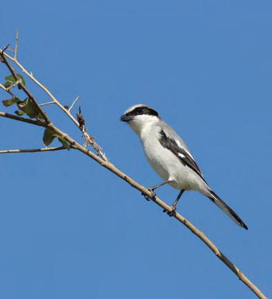 Loggerhead Shrikes typically can be found near fields and other clearing areas with low grass or shrubs. They will perch themselves high up on a tree limb, power line or building and scan fields for their next meal. The shrikes feed on everything including insects, small mammals, reptiles and even other birds nearly as large as them. If you’ve ever seen an insect or reptile impaled on barbed wire fencing, there’s probably a shrike nearby. Often times, if the shrike catches large prey, they will impale them on a thorn or barb on a fence to avoid struggling with the prey or to keep it from escaping.